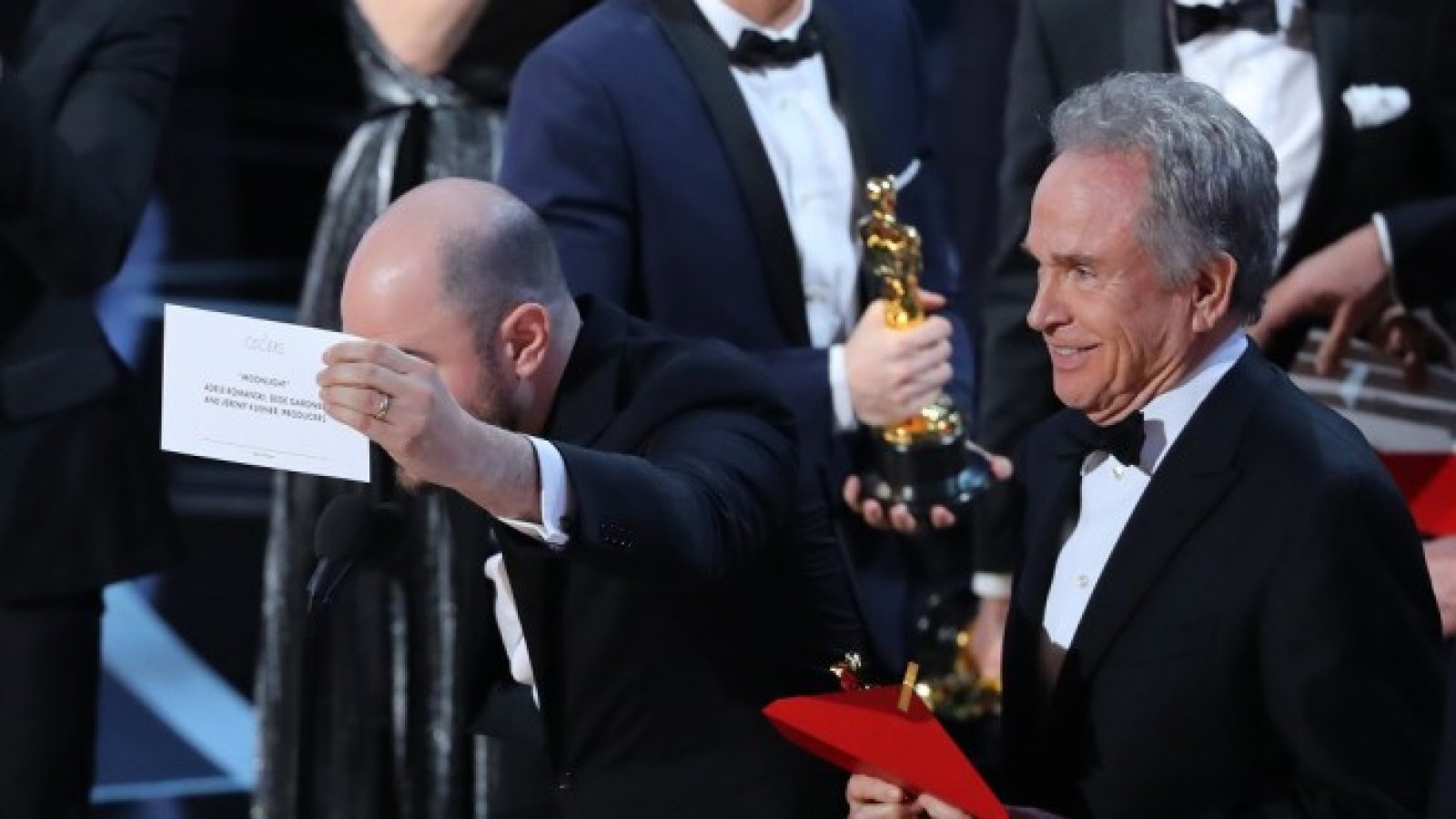 Докато екипите и на двата филма чакаха неудобно на сцената, Бийти обясни, че му е бил даден грешният плик.