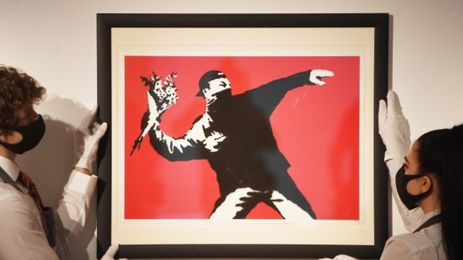 Банкси, чието истинско име все още не е известно, е високо оценяван в целия свят заради своите остри, социално критични коментари. За произведението „Любовта е във въздуха“, което сега излиза на търг, той създава уличен боец в стил графити, който полумаскиран се протяга назад, за да хвърли експлозив или камък в противоположната посока. Но вместо оръжие, художникът пъха в юмрука на демонстранта ръчно рисуван букет цветя.