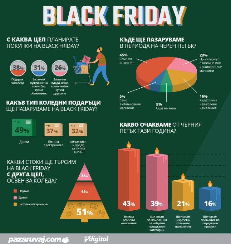 Тази година най-високо е търсенето на битова електроника (52%). На второ място е облеклото (45%), на трето място са обувките (35%), а на четвърто място с 34% са мобилните телефони, таблети и техни аксесоари (калъф, селфи стик, стойка и др.).