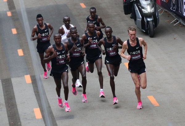 Специален автомобил водеше темпото с лазери пред кениеца и пейсърите. Преди всичко заради него опитът няма да бъде признат за световен рекорд. Кипчоге, в блестящо бяло, оставаше постоянно с осем или девет секунди под целевото време при непрекъснатите измервания. Специален лазер му показваше в зелено откъде да мине. Напитките идваха, когато Кипчоге си поискваше. Това не е класическо състезание по маратон. Световният рекорд не се зачита - както в Монца. Но не това беше въпросът.