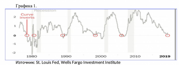Кривата на доходността в САЩ, която показва лихвите по американския държавен дълг при различни падежи в даден момент от време, официално обърна своя наклон в средата на август и създаде мрачни очаквания за перспективите пред местната и глобална икономика. Все пак това не се бе случвало от 2007 г. - непосредствено преди избухването на глобалната финансова криза и икономическа рецесия. Множество експерти, политици, анализатори и инвеститори побързаха да акцентират върху обърнатата крива (inverted yield curve/IYC) поради опасения в световната архитектура на стопанството и/или поради факта че, историята показва, че този индикатор е надежден предсказател за предстояща криза (вж. графика 1).
