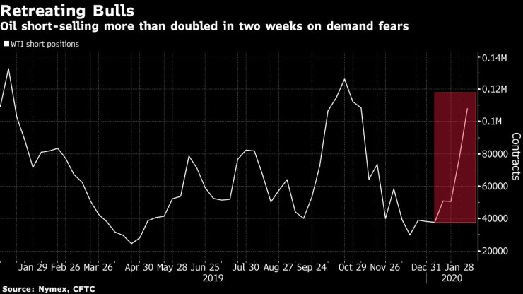 Цените на суровия петрол се сринаха, след като вирусът предизвика хаос и притеснения за икономиката на най-големия вносител на петрол в света, докато китайските рафинерии намаляват количеството, което преработват, с около 15%. Цените могат да се окажат под допълнителен натиск, ако преговорите, насочени към прекратяване на конфликта в Либия, където блокадата на пристанищата изтласка производството до най-ниското ниво от 2011 г., доведат до възстановяване на производството, коментира Bloomberg.