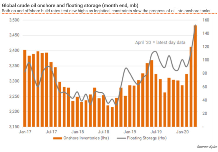 През последните дни бяха резервирани десетки петролни танкери за складирането на най-малко 30 милиона барела самолетно гориво, бензин и дизел в т. нар. плаващи хранилища, понеже наземните резервоари са пълни или вече запазени, сочат данни от бранша.