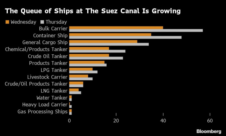 В работата по измъкването, която продължава от вторник насам, участват влекачи и багери – оборудване, което изглежда миниатюрно в сравнение с кораба. Засега обаче усилията са без резултат. В задръстването на Суецкия канал вече има над 300 плавателни съда с товари за милиарди долари. За сравнение, в сряда те бяха само 186, показват данни на Bloomberg. Според изчисления на Refinitiv от вторник насам над 30 петролни танкера чакат от двете страни на канала, за да преминат.