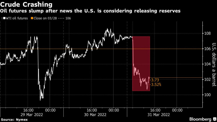 Цената на петрола намалява в четвъртък, докато инвеститорите обмислят сигналите за възможно освобождаване на щатски резерви на суровината в опит да се озапти инфлацията и недостигът на доставки след руската инвазия в Украйна, пише Blomberg.