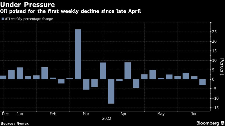 Петролът поевтинява в петък, когато инвеститорите продължават да преценяват възможността от допълнително затягане на паричната политика от централните банки в опит да преборят инфлацията, съобщи Bloomberg.