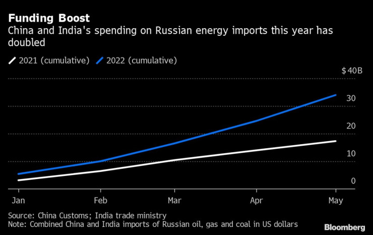 Разходите на Индия и Китай за руски енергийни продукти се увеличават близо двойно. Графика: Bloomberg