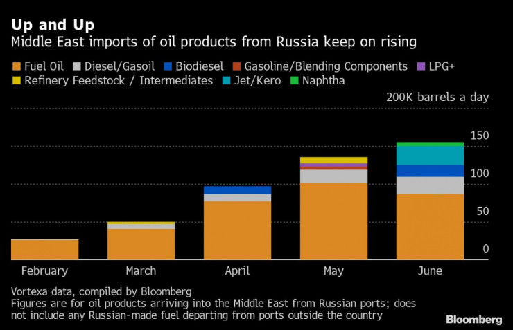 Вносът на петролни продукти от Русия към Близкия изток продължава да расте. Графика: Bloomberg