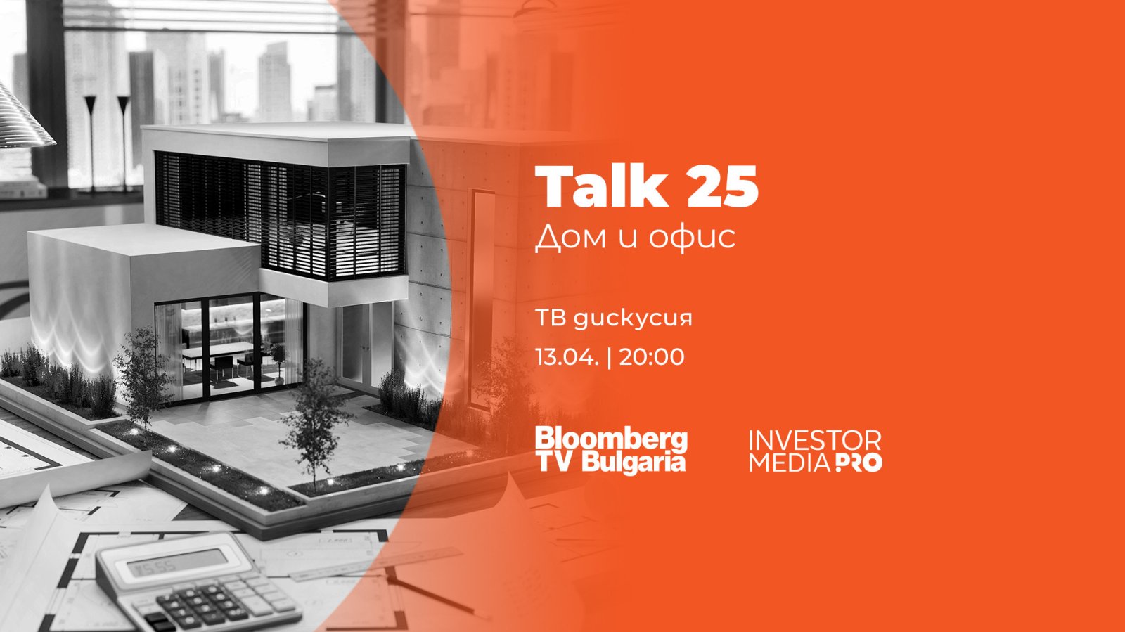 Кои са факторите, които определят цените на жилищата? Как се променя пазарът на офис площи и какви са новите тенденции в устойчивото строителство? Влияе ли динамиката на икономиката върху възможностите за покупка и наем? На тези и още ключови въпроси ще отговори специалното телевизионно издание "Talk 25: Дом и офис", част от поредицата телевизионни дискусии на Bloomberg TV Bulgaria - Talk 25. Излъчването ще бъде на 13 април от 20:00 часа по Bloomberg TV Bulgaria.