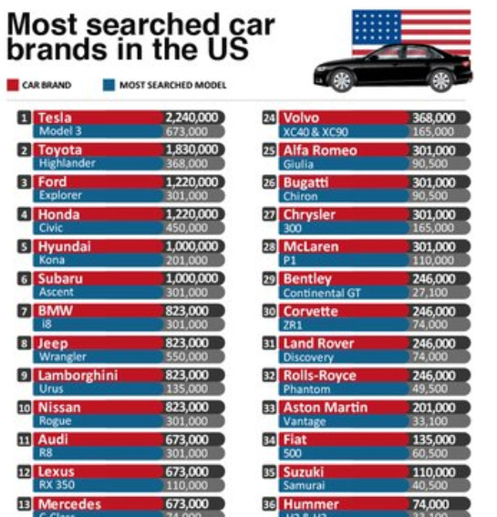 В САЩ съответно най-търсената марка от потребителите е Tesla с впечатляващите 2 240 000 допитвания до Google. При моделите начело е Model 3 с 673 000. Следва Toyota с 1 830 000 търсения, като тук най-популярният модел е Higjlander - 368 000. В тройката попада и Ford с 1 220 000, като №1 при моделите е Explorer - 301 000.