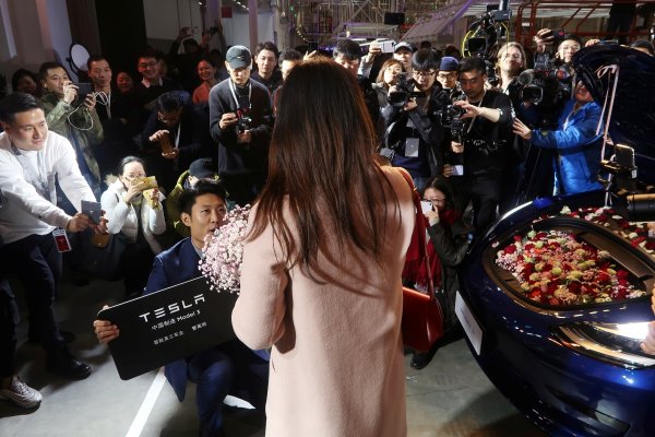 Тълпа от около 200 души, включително представители на медии и работници на Tesla, се събра в завода в понеделник на тържество, когато Том Жу, ръководителят на компанията за Велик Китай, предаде първите коли. Един от служителите, който получи кола, я представи на приятелката си, заедно с цветя, и ѝ предложи брак. Тя прие с кимане и се целуваха, предава Bloomberg.