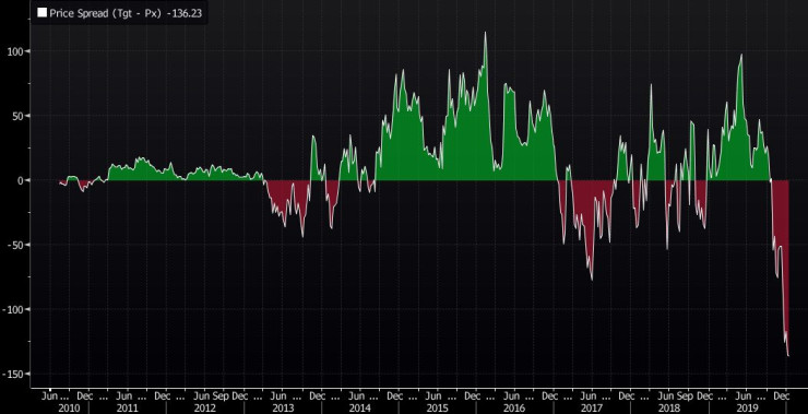 Wall Street обаче може би все още не е напълно убеден във всичко това. Въпреки прилива на положителни анализи през последните седмици спредът между целевата цена на анализаторите и акциите на Tesla все още е най-широка, откакто компанията осъществи първично публично предлагане през 2010 г., както показва и диаграмата по-долу.