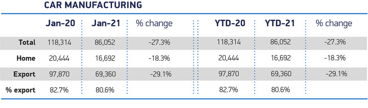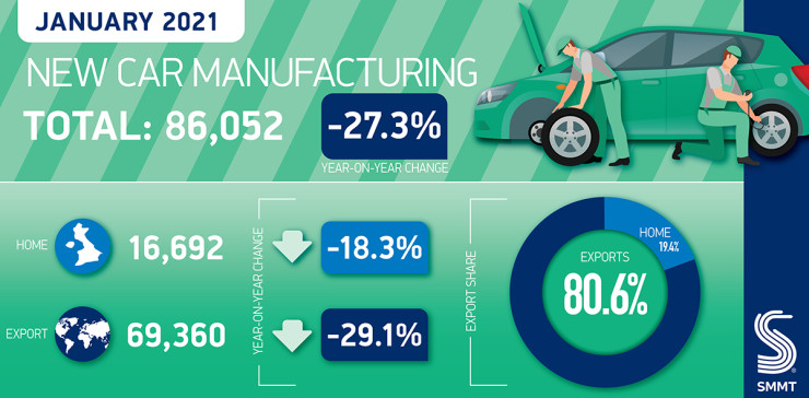 Производството на автомобили в Обединеното кралство е спаднало с 27,3% спрямо година по-рано до 86 052 броя през януари 2021 г., отбелязвайки най-лошото представяне през януари от 2009 г. насам и 17-и пореден месец на спад, показват данни на The Society of Motor Manufacturers and Traders Limited (SMMT).