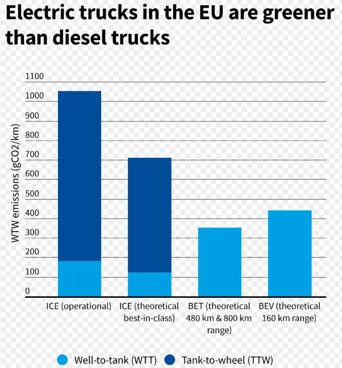 Това се дължи главно на следните фактори: цените на батериите падат по-бързо от очакваното; ходовата част на електрическите автомобили е по-ефективна от остарялата дизелова технология; 65% от товарните релации на камионите в Европа са под 500 км, което означава, че не е необходимо да се търси заряд, който да издържа много над тази граница.