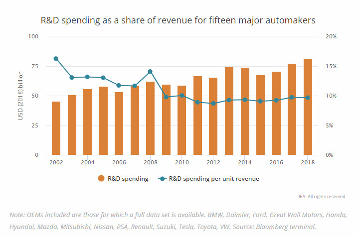 Разбира се, има допълнителни ползи за държавната подкрепа. Първо, дори при днешните политики се генерират приблизително 4 долара потребителски разходи за всеки долар, изразходван от правителствата. Освен това, подпомагайки пазара, стимулите оказват значително влияние върху иновациите. От 2015 г. насам разходите за проучвания и разработки на петнадесет основни автомобилни производители се увеличават с по-бързи темпове, отколкото във всеки период от началото на века и, което е важно, с по-бързи темпове от ръста на приходите.
