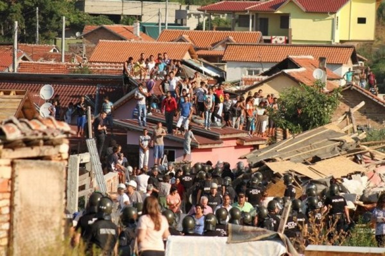 Акцията по събарянето доведе до сблъсъци между жандармерия и роми рано тази сутрин. Жителите на квартала посрещнаха полицията с жива верига и импровизирана барикада. Наложи се униформените да проправят път на багерите с щитовете си.