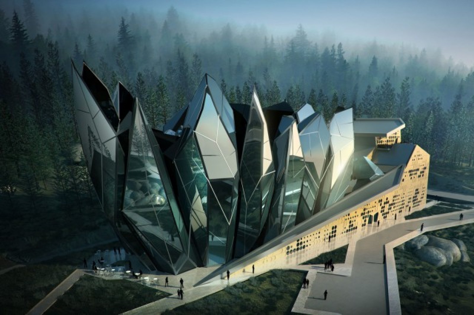 Концепцията е за сграда с кристални форми, разположена сред характерните за района каменни реки.