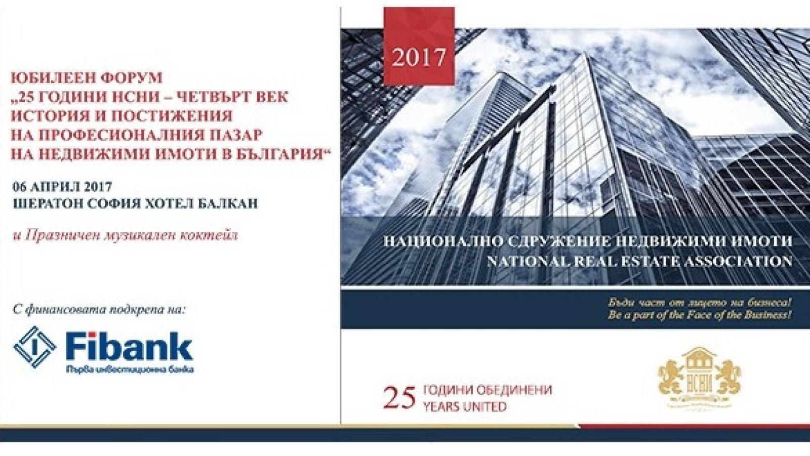 Тържественият юбилеен форум „25 години НСНИ – четвърт век история и постижения на професионалния пазар на недвижими имоти в България“ ще се състои на 6 април 2017 г. в София Хотел Балкан, гр. София. Събитието ще отбележи 25-та годишнина от създаването на организацията и началото на професионалния пазар на недвижими имоти в страната.