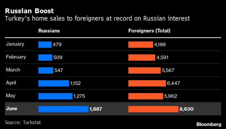 Силният ръст е отбелязан благодарение главно на ускоряващото се търсене от страна на руски граждани след началото на войната в Украйна. Руснаци са закупили 1887 жилища в Турция през юни и така общият брой на придобитите от тях имоти в страната тази година вече достига 5849, което ги прави най-голямата група купувачи по националност.