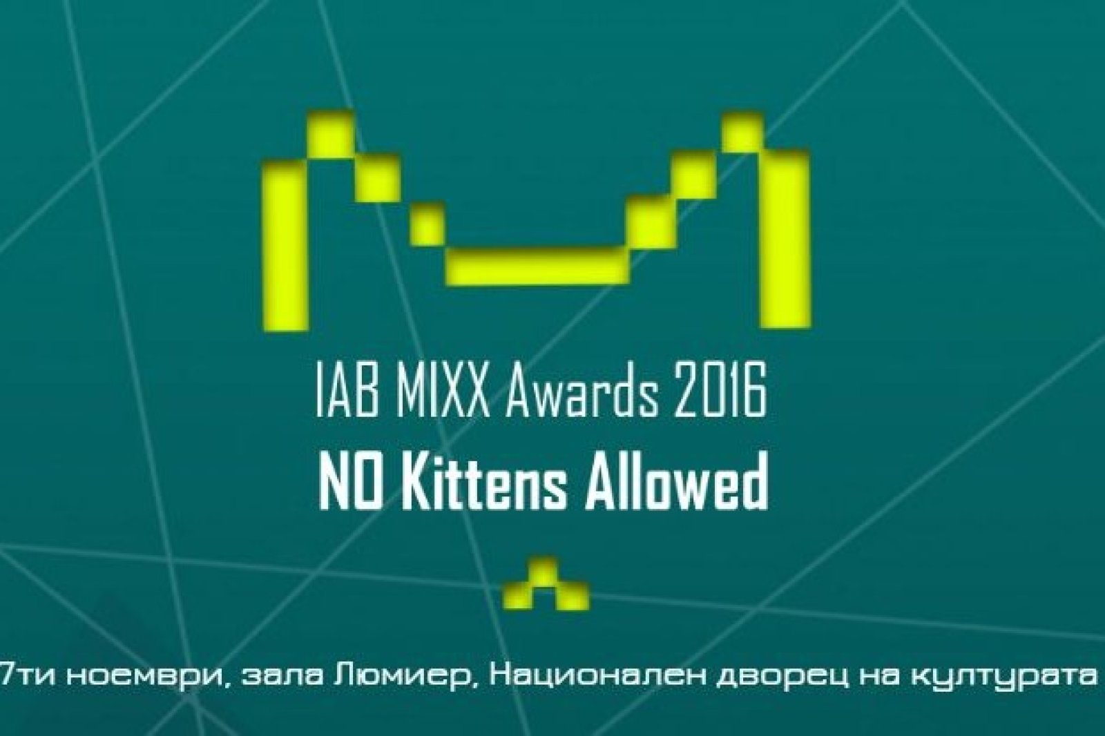 На 17 ноември в НДК IAB MIXX Awards 2016 ще протече под мотото „NO Kittens Allowed", като в надпреварата участват рекордните 97 кандидатури на компании и агенции. Веднага след обявяването на победителите в конкурса всички гости на събитието могат да обменят контакти и опит в неформална обстановка – на специално парти в ресторант La Casа.