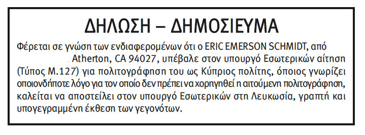 Бившият главен изпълнителен директор на Google Ерик Шмит финализира своя план да стане гражданин на островната държава Кипър, ставайки един от най-известните американци, които се възползват от противоречивата програма за „продажба на паспорти”, пише в свой анализ ReCode.