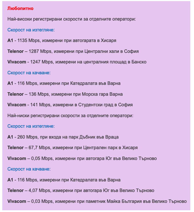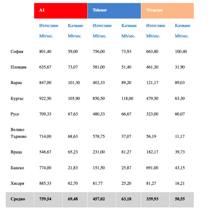 В София и трите телекома са показали високи скорости с предимство на А1 – средно 801 Mbps, Telenor 756 Mbps и Vivacom 663 Mbps. Същото важи и за останалите по-големи градове в страната: Пловдив А1 – 635 Mbps, Telenor – 581 Mbps, Vivacom – 461 Mbps; Варна А1 – 847 Mbps, Telenor – 402 Mbps, Vivacom – 121 Mbps; Русе А1 – 709 Mbps, Telenor – 480 Mbps, Vivacom – 323 Mbps.