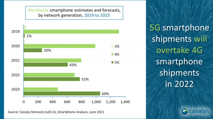 „5G е готов за масовия пазар“, казва експертът на Canalys Бен Стантън. Всички големи доставчици като Apple и Samsung Electronics вече имат в портфолиото си мобилни телефони с възможност за 5G. Canalys изчислява, че 43 процента от устройствата, продадени през 2021 г., ще бъдат 5G смартфони. Към първото тримесечие делът им е 37%.
