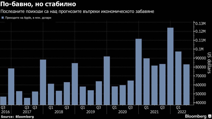 „Виждаме някои признаци на мекота тук и там", каза Тим Кук, главният изпълнителен директор на Apple, в интервю в четвъртък. „Но като цяло очакваме приходите да се ускорят през септемврийското тримесечие в сравнение с резултатите от юни на годишна база“.