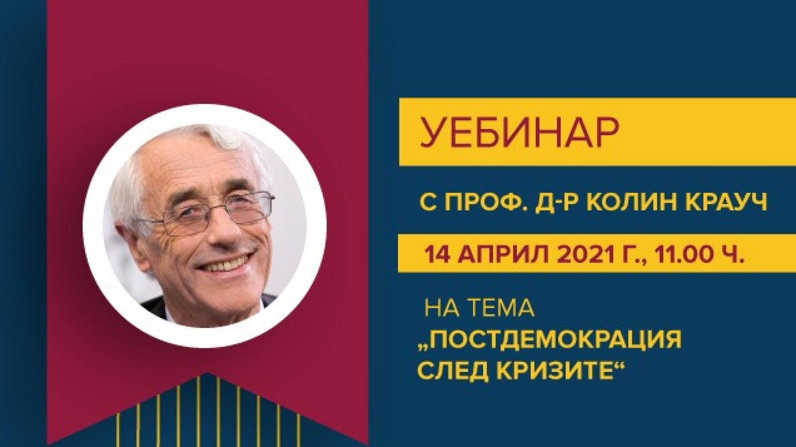 Темата на онлайн срещата с проф. д-р. Крауч е „Постдемокрация след кризите“. Това е и заглавието на най-новата книга на проф. Крауч, издадена на български език в края на 2020 г. Самият термин постдемокрация е измислен от него през 2000 г.
