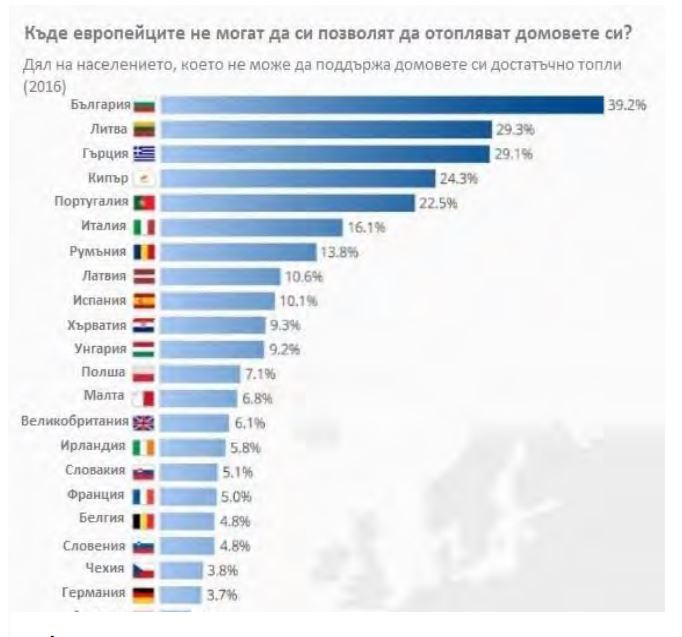 Данните показват, че 39,2% от населението в България не може да поддържа домовете си достатъчно топли. Това оказва неблагоприятно въздействие върху здравето. Това е най-високият процент в Европейския съюз, в който около 11% от населението е засегнато от енергийната бедност.