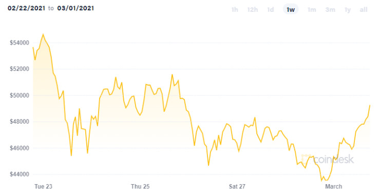Цената на биткойна обаче остава над пет пъти по-висока спрямо предходната година. Към 18 ч. българско време криптовалутата поскъпва с близо 14% до 49 392,85 долара. Това обаче остава далеч от рекордната му стойност, достигната само допреди седмица от над 58 хил. долара.