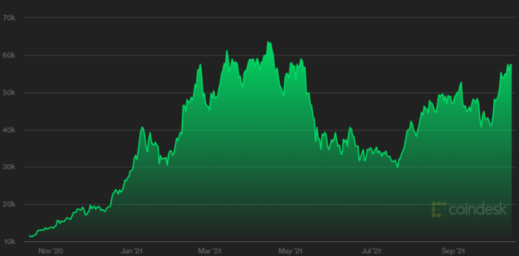 Към 10:30 ч. българско време биткойнът поскъпва с 2,8% до 59 342,18 долара – близо до най-високото му равнище от средата на април. От началото на годината монетата удвои стойността, приближавайки се все по-близо до рекорда си от близо 65 хил. долара.