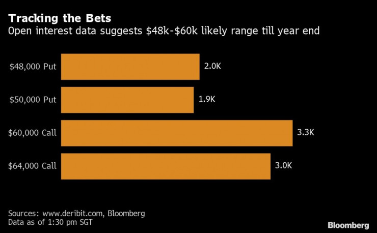 Според данните за отворени договори за опции, изтичащи в края на годината, инвеститорите виждат пода на цената на биткойна около 48 хил. долара, а тавана около 64 хил. долара. Значителният брой оценки между 48 хил. и 50 хил. долара говори, че продавачите на тези контракти виждат това равнище като базово. По същия начин диапазона 60 хил.-64 хил. долара сигнализира очакван таван от продавачите на тези договори.