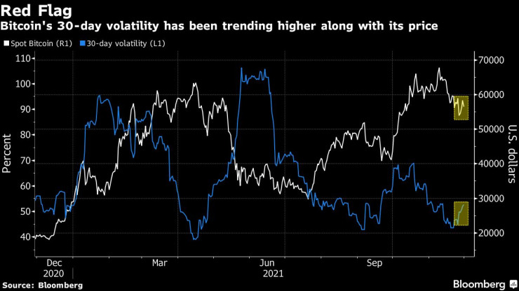 Както винаги, когато става дума за толкова волатилен актив, има технически модели, които предполагат предпазливост. Мярка за реализираната волатилност на биткойна расте в унисон с цената – комбинация, която може да бъде тласната до точка на пречупване при ново поскъпване.