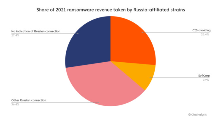 Почти три четвърти от приходите от атаки със зловреден софтуер миналата година – приблизително 400 млн. долара – са отишли към адреси, които „много вероятно“ са свързани с Русия. Това показва доклад на криптоаналитичната компания Chainalysis, цитиран от CoinDesk.