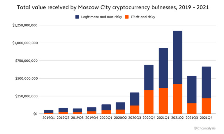 Русия е дом на множество криптобизнеси, които обработват значителен обем трансакции, включително от незаконни адреси. Общо тези бизнеси получават криптовалути на стойност стотици милиони долари на тримесечие, като пикът на сумата е близо 1,2 млрд. долара през второто тримесечие на 2021 г.