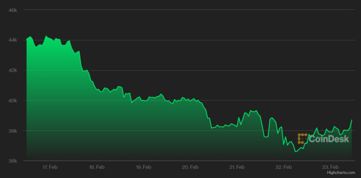 Цената на биткойна се възстановява обратно на тенденцията, която следват американските акции на фона на растящото напрежение с Украйна.