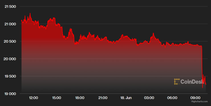 Минути преди 10:30 ч. българско време токенът изтрива 6,8% до 19 404 долара за последните 24 часа, показват данни на CoinDesk.