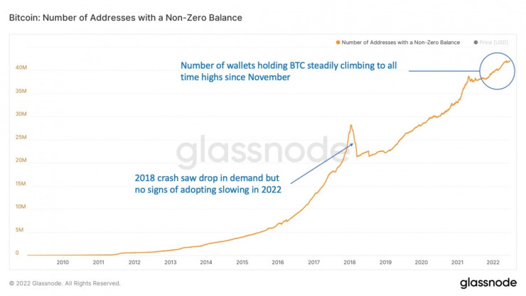 Броят на портфейли с ненулева наличност на биткойни в тях расте. Графика: Glassnode/Bloomberg