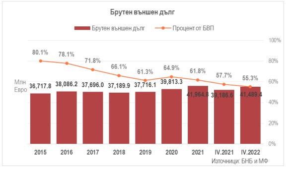 Брутният външен дълг (частен и държавен) на България в края на април възлиза на 41,489 млрд. евро, което е с 5,9% повече в сравнение с година по-рано. Така той представлява 55,3% от прогнозирания от Българската народна банка брутен вътрешен продукт (БВП) на страната за тази година, показват предварителните данни на БНБ.