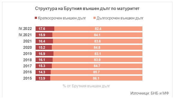 Експертите на централната банка изчисляват, че към края на април краткосрочните задължения са 7,299 млрд. евро (17,6% от брутния дълг) и се увеличават със 17,3% на годишна база.