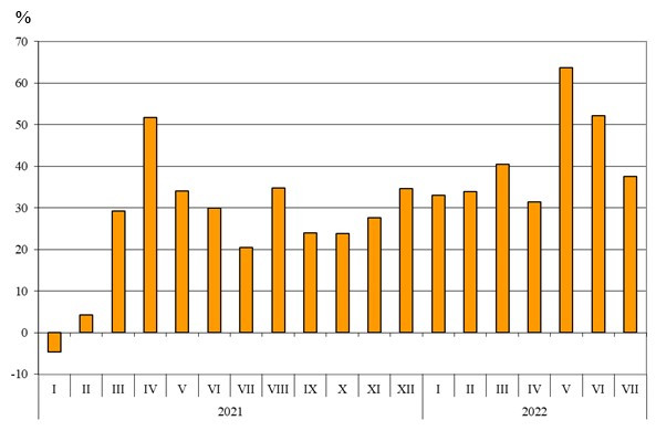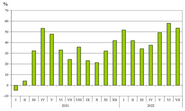 През първите седем месеца на 2022 г. при засилена производствена активност износът на български стоки расте с 41,7% в сравнение със същия период на 2021 г. Според предварителните данни за стокообмена на България, представени от Националния статистически институт (НСИ), експортът в края на юли възлиза на 54,288 млрд. лв.