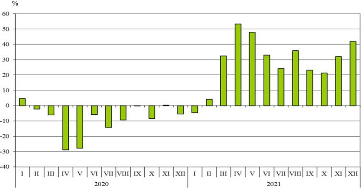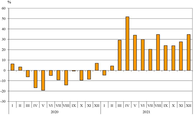 НСИ публикува и окончателните данни за стокообмена на България през миналата година. Те показват, че изнесените стоки са на стойност 68,431 млрд. лева, или с 24,9% повече спрямо 2020 г. При сравнение на месечните данни за миналата година с данните за съответния месец на 2020 година най-голям ръст се наблюдава при износа през април (51,8%), а спад е регистриран само през януари (4,6%).