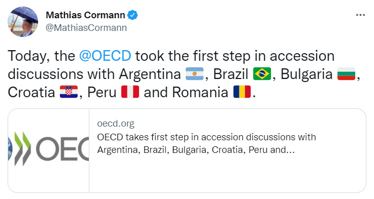 Заедно с нас процесът по членство започват още Аржентина, Бразилия, Хърватия, Перу и Румъния.