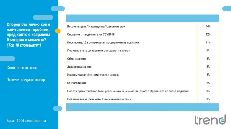 Високите цени са най-големият проблем пред България в момента - това са отговорили 44% от участниците в проучване на социологическата агенция "Тренд" на отворен въпрос (без предварително зададени опции). Инфлацията се възприема като най-големия проблем от значително повече хора от пандемията от COVID-19, която заема второто място с 12%.