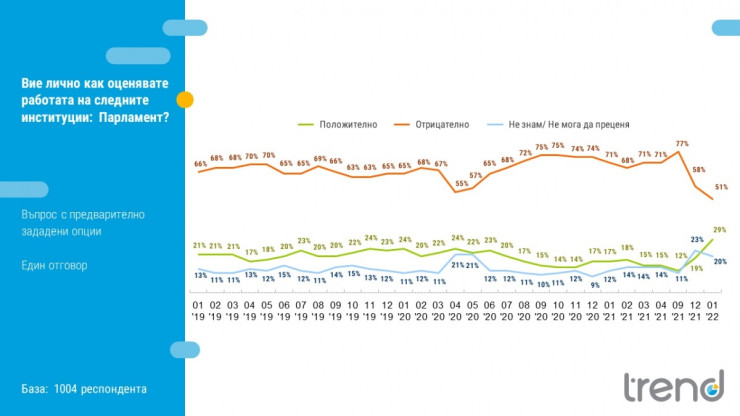 През 2021 г. оценката за работата на парламента падна на критично ниски нива, най-вече заради невъзможността да излъчи кабинет. Положителните оценки се движиха около 15%, като дори през септември стигнаха до 12%. Отрицателните пък отбелязаха нива от 77%. Изборите за 47-ото Народно събрание и успехът му в съставянето на правителство водят до ръст в подкрепата към парламента до 29%, а отрицателните оценки падат до 51%.
