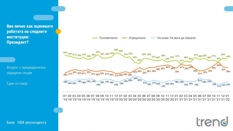 През втората половина на 2021 г. президентът Румен Радев беше влязъл в тенденция на повишаване на отрицателните оценки за неговата работа, отбелязват социолозите. Те обясняват това най-вече с отговорността, която той носеше за служебното правителство, при което неминуемо част от социалното недоволство спрямо властта рефлектираше и върху оценките за работата на президента.