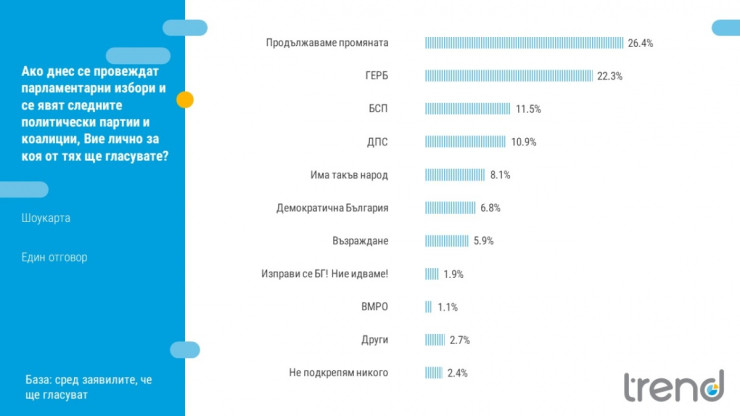 „Продължаваме промяната“ е първа политическа сила с 26,4% от заявилите, че ще гласуват на евентуални избори. ГЕРБ остават близко до изборния си резултат с 22,3%.