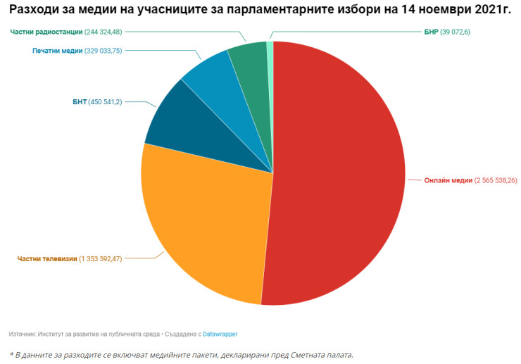 И в тази кампания основните вложения са за медийно отразяване - 4 982 103 лв. В най-голяма степен те са насочени към онлайн медиите - за агитация в сайтове са похарчени 2 565 538 лв. В тази категория вероятно са отчетени и сумите, насочени към социалните мрежи. Така се запазва тенденцията партийната комуникация в онлайн пространството да е предпочитана по време на кампаниите. Средствата за интернет реклама вече значително надминават тези, отделени за частни телевизии - 1 353 592 лв.