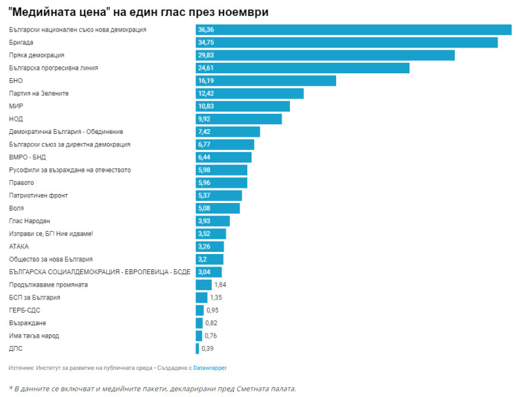 Най-скъпите гласове са подадени за формациите, разчитащи основно на медийни пакети, за да финансират своите кампании - Български национален съюз -НД, Бригада, Пряка демокрация и други. “Цената на глас” на тези партии достига до 36 лв.
